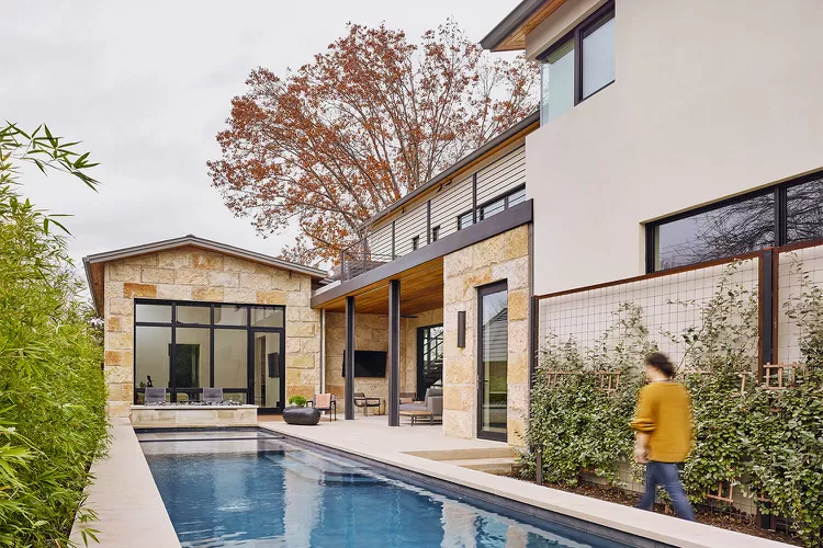 Using the same materials on the pool house and surrounding structures helps create visual continuity. Stone, wood, or concrete finishes can visually connect outdoor living areas, making the entire space feel intentional and unified.
