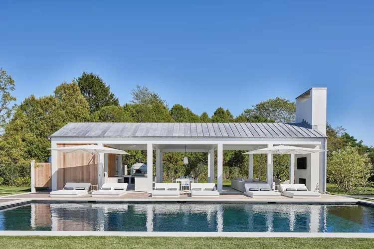 An open-plan pool house provides shade and comfort while maintaining an airy feel. Covered seating, dining, and cooking zones make it easy to enjoy the outdoors without sacrificing convenience or style.