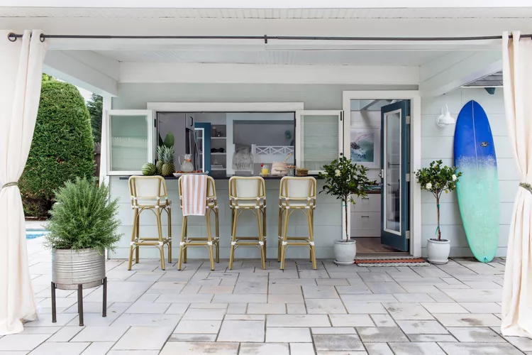 Transforming a compact pool house into a wet bar adds a resort-style touch to your outdoor area. Open walls or folding doors create a seamless connection between the pool and the bar, making it ideal for entertaining and summer gatherings.