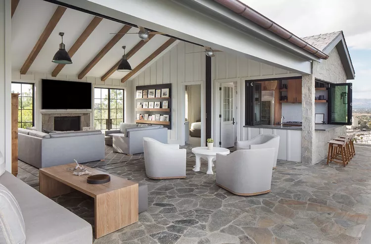 An outdoor fireplace extends the usability of a pool house beyond warm weather. It creates a cozy gathering spot and adds visual interest to patios and covered seating areas.