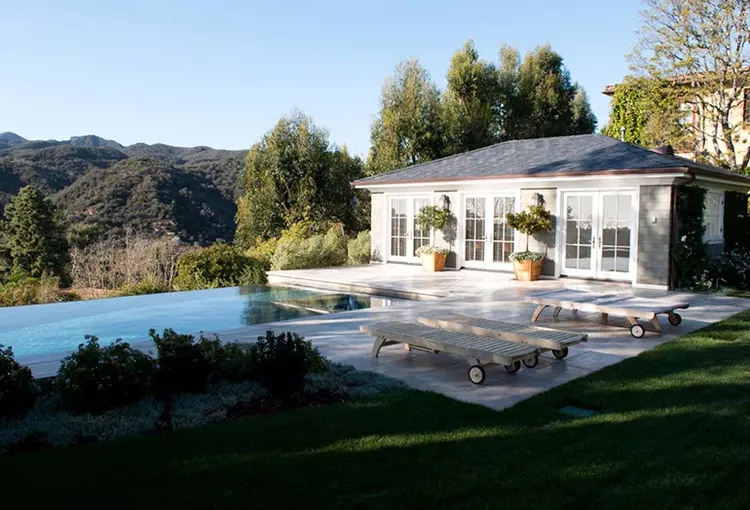 A Murphy bed allows a pool house to serve multiple purposes. By day, the space functions as a lounge, while at night it easily transforms into a guest bedroom.
