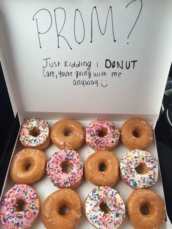 Food-themed promposals, such as “Prom Donuts,” are both delightful and delicious. Displaying donuts with a playful sign or creative arrangement adds charm and whimsy.