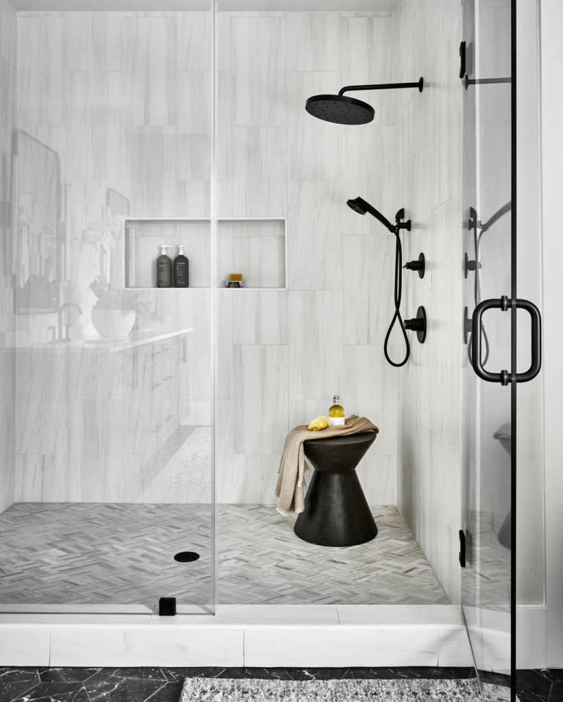 Bold black hardware punctuates soft white veining, creating a dramatic yet serene space. A sculptural stool replaces a traditional bench, giving the shower a gallery-like quality.