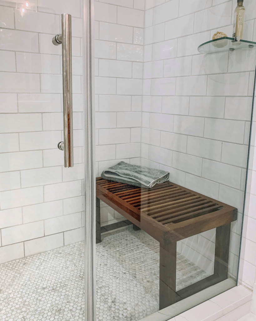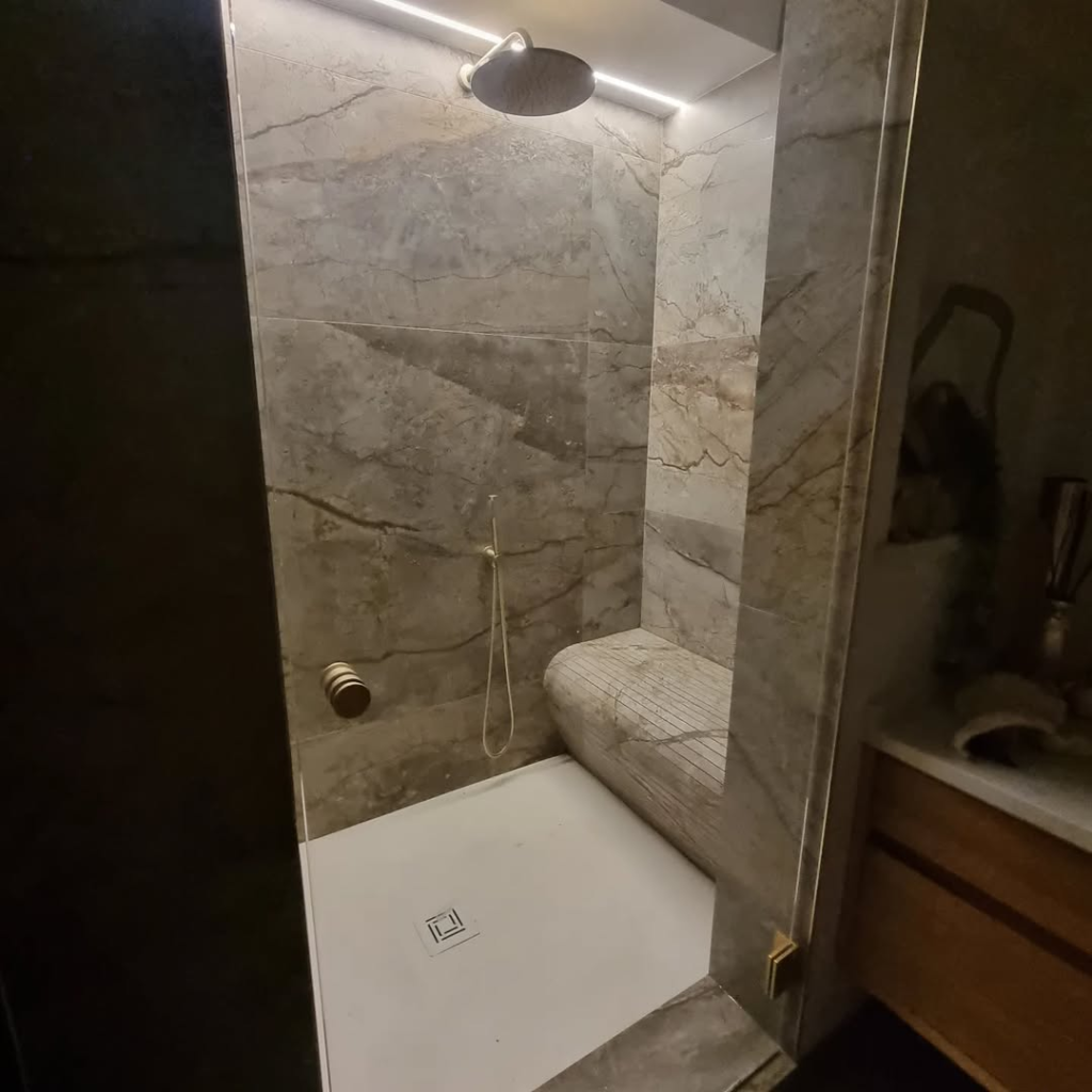 The marble bench isn’t just for sitting—it’s a display moment. Imagine a silver tray holding eucalyptus sprigs and a neatly rolled towel, turning every shower into a ritual of sophistication.