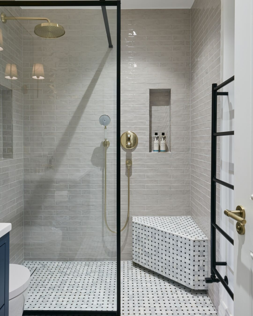 Subtle taupe subway tiles with a gentle gloss create depth, while geometric benches and matching floor tiles provide boutique hotel vibes. Brushed gold fixtures elevate the palette without overwhelming it.