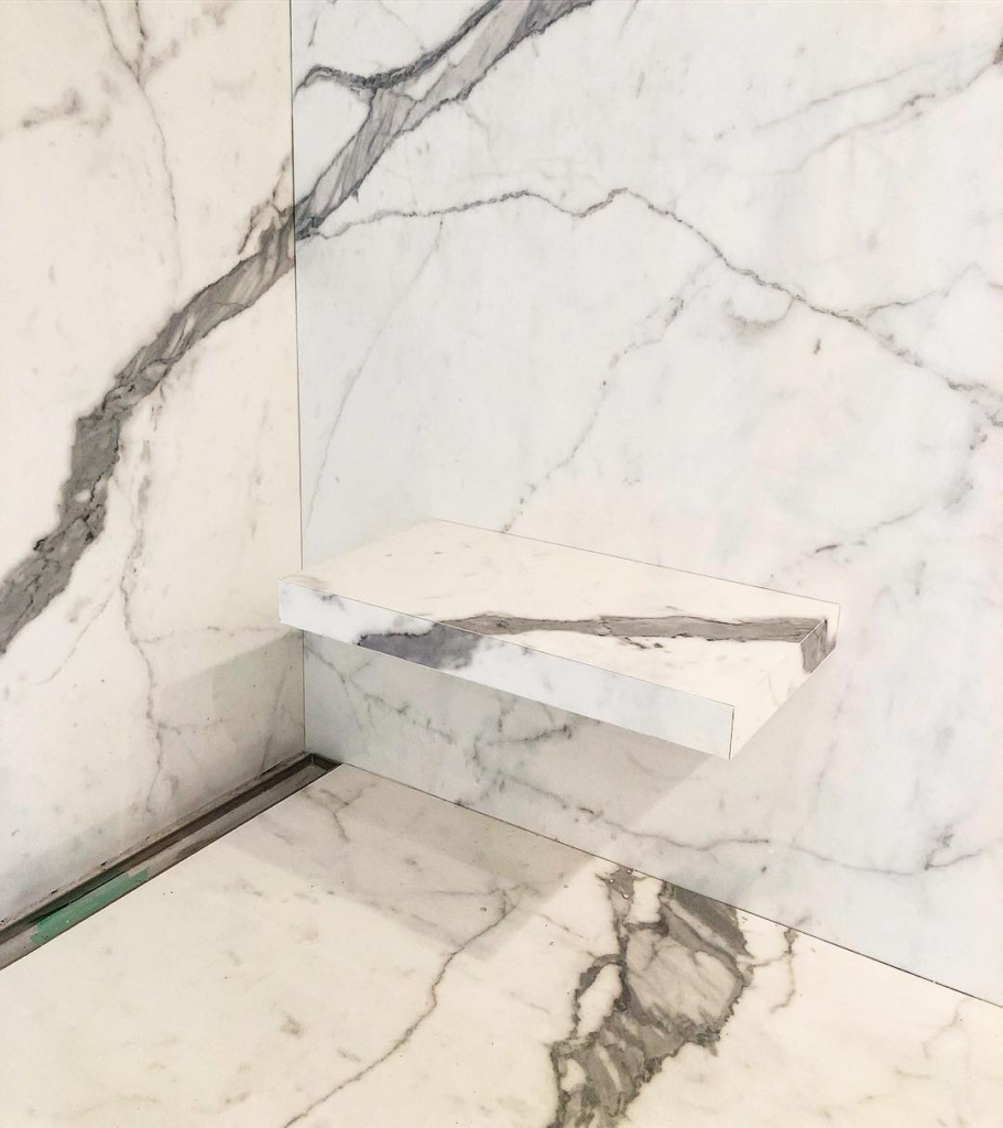 A fully wrapped marble shower emphasizes the beauty of veining. The bench appears almost like art—floating, elegant, and visually integrated.