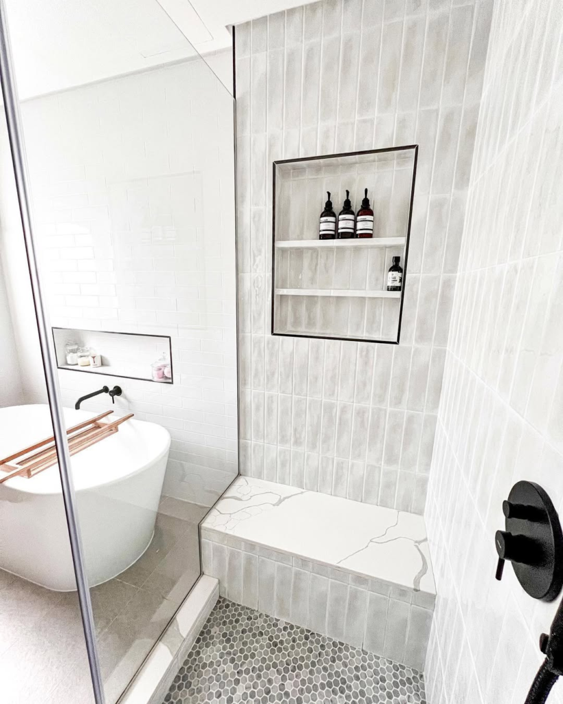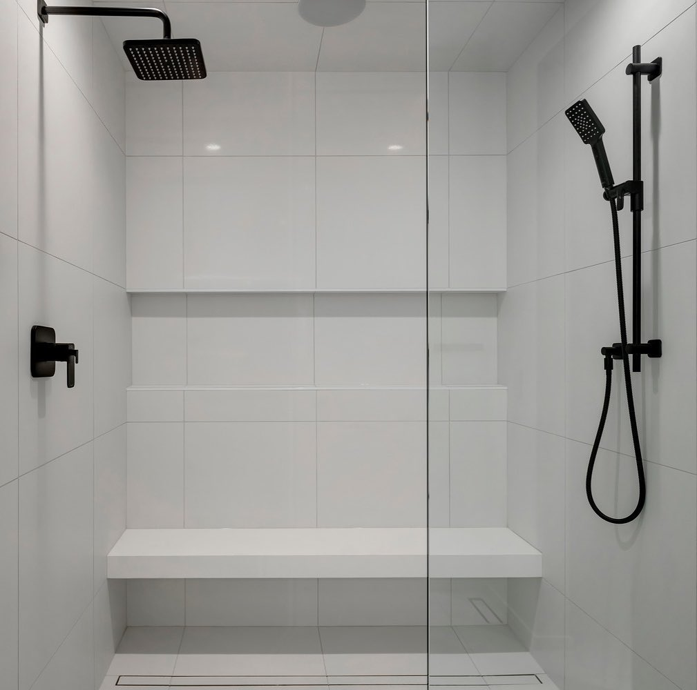 Order and structure define this shower. A full-width bench, integrated shelving, and bold black fixtures create a harmonious balance against a white-on-white backdrop.