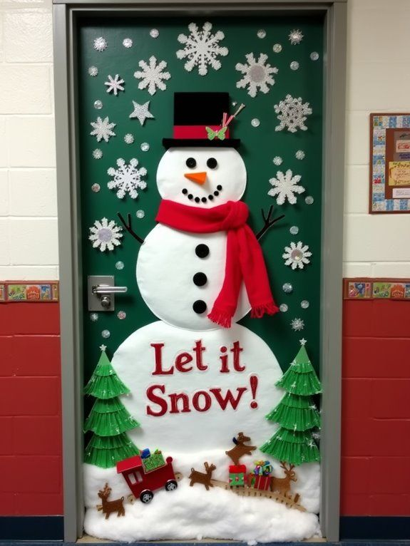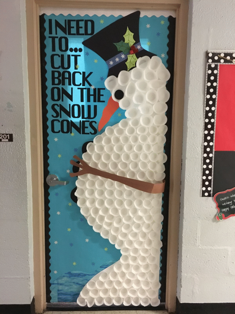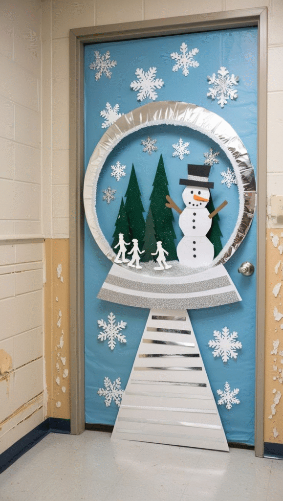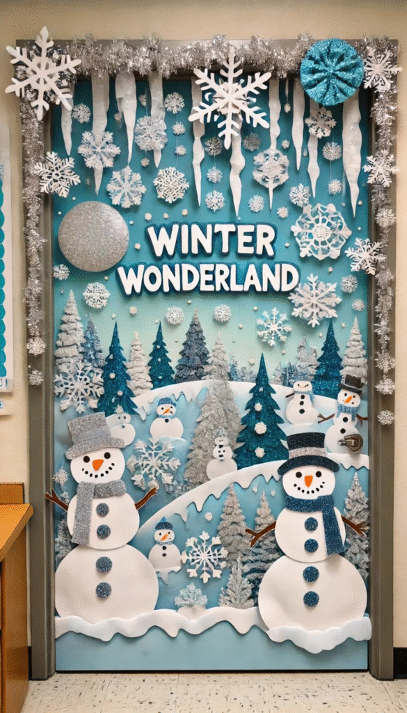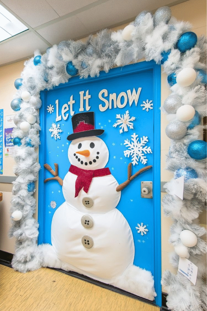 This idea focuses on creating a full wintery scene rather than just a single character. The snowman becomes part of a larger, enchanted setting, giving your door a bright and cheerful atmosphere. Soft details help tie the whole look together and enhance the snowy aesthetic. If you’re aiming to make your entryway feel magical, this style delivers beautifully.