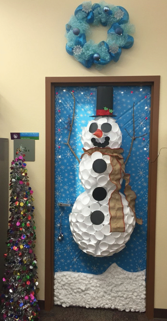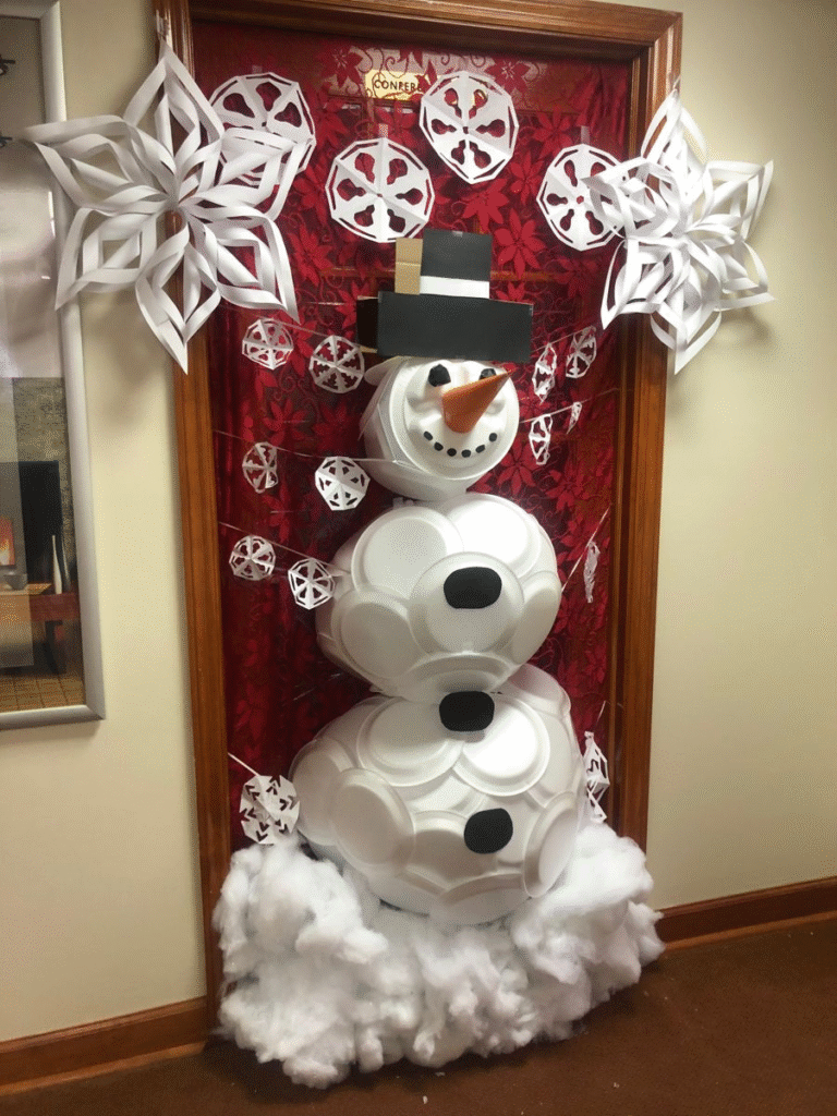 Using paper plates adds a fun craft-style dimension to your décor, giving the door more texture and visual interest. The layered look helps the snowman feel more dynamic and playful. It’s a simple DIY approach that still produces a standout design, making it great for anyone who enjoys hands-on creativity.