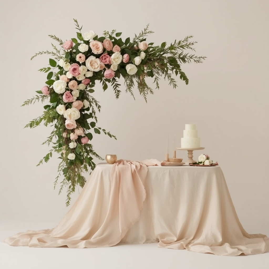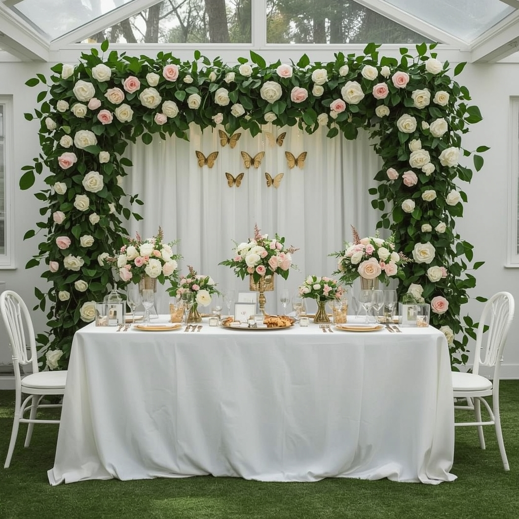 Pair these elements with floral arrangements and soft greenery throughout the venue. Choose an airy color palette featuring whites, pale pinks, and gentle greens to maintain elegance.