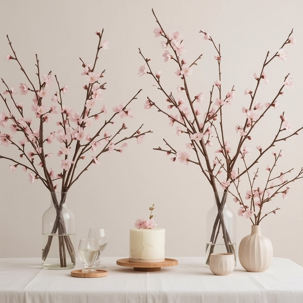 Use light linens and minimal décor to allow blossom accents to shine. Faux branches can be arranged in tall vases, or fresh stems can be placed in simple containers for a natural look.