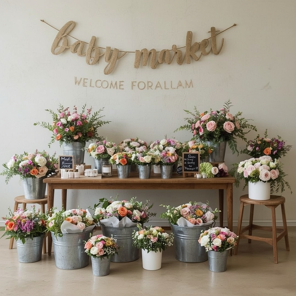 Transform your baby shower into a charming floral market experience. Arrange buckets of mixed blooms, rustic display stands, and handwritten signs to create a lively yet organized setup.