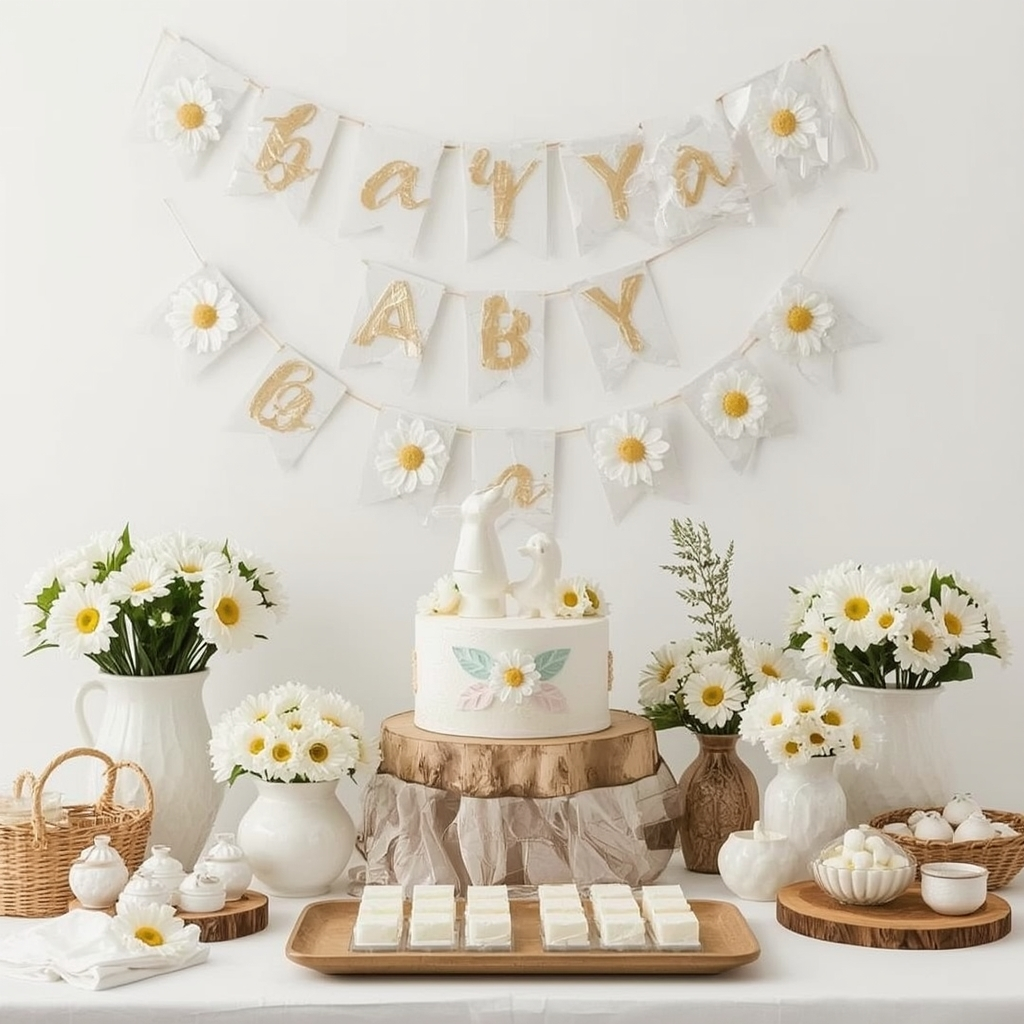 Daisy-inspired décor creates a cheerful and uncomplicated baby shower atmosphere. Incorporate fresh or faux daisies into centerpieces, cake decorations, and signage.