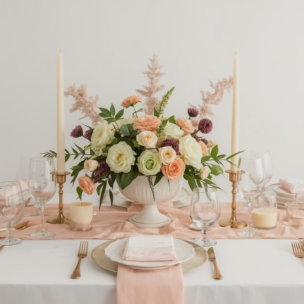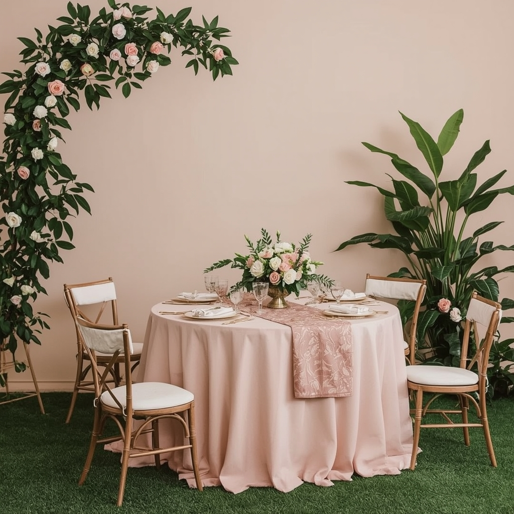 A blush garden theme blends soft pink tones with greenery and light florals. Use blush linens, floral runners, and understated metallic accents for warmth.