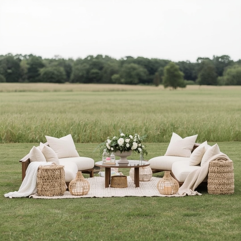 A meadow picnic baby shower captures the simplicity of an open spring field. Use low seating, natural fabrics, and understated floral arrangements to build a relaxed setting.