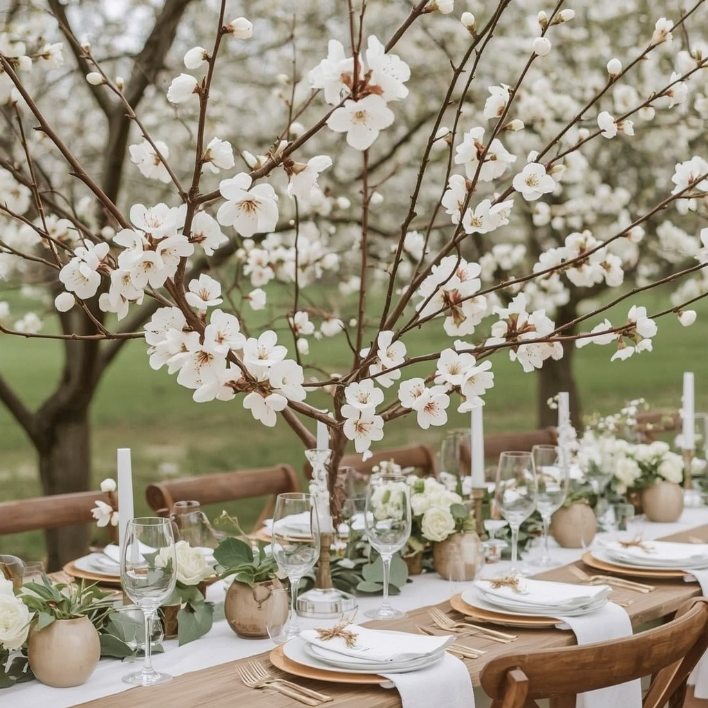 Draw inspiration from blooming orchards by incorporating branches with blossoms, soft greenery, and natural wood accents. Light linens and simple tableware keep the space airy.