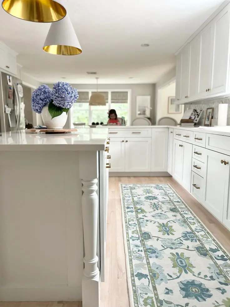 Swap heavy or dark rugs for lightweight options in pastel or floral patterns. A soft rug underfoot near the sink or island adds warmth and comfort while complementing the overall spring aesthetic.