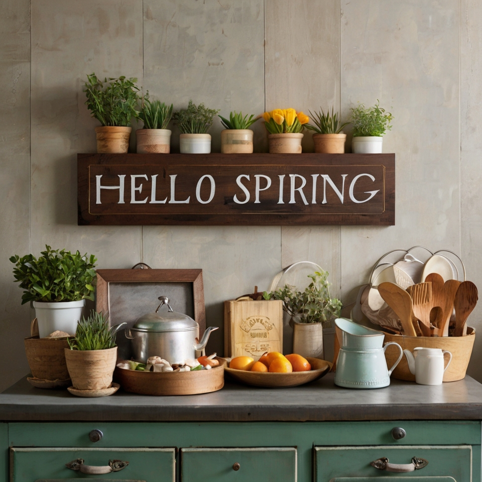 Hang wooden or metal signs with spring-themed messages like “Hello Spring” or “Bloom Where You’re Planted.” These playful touches add charm and make your kitchen feel welcoming and in tune with the season.