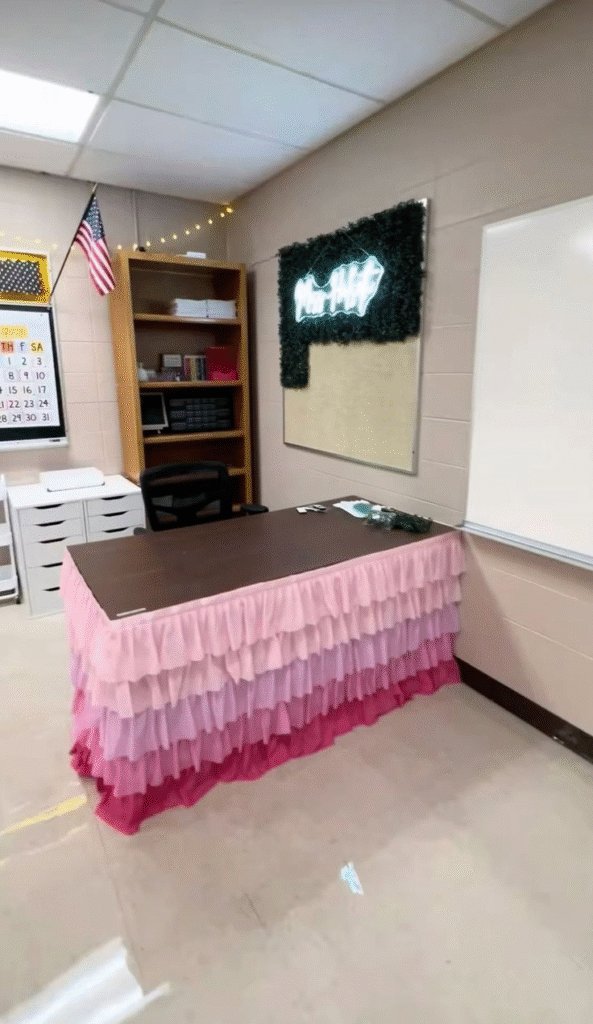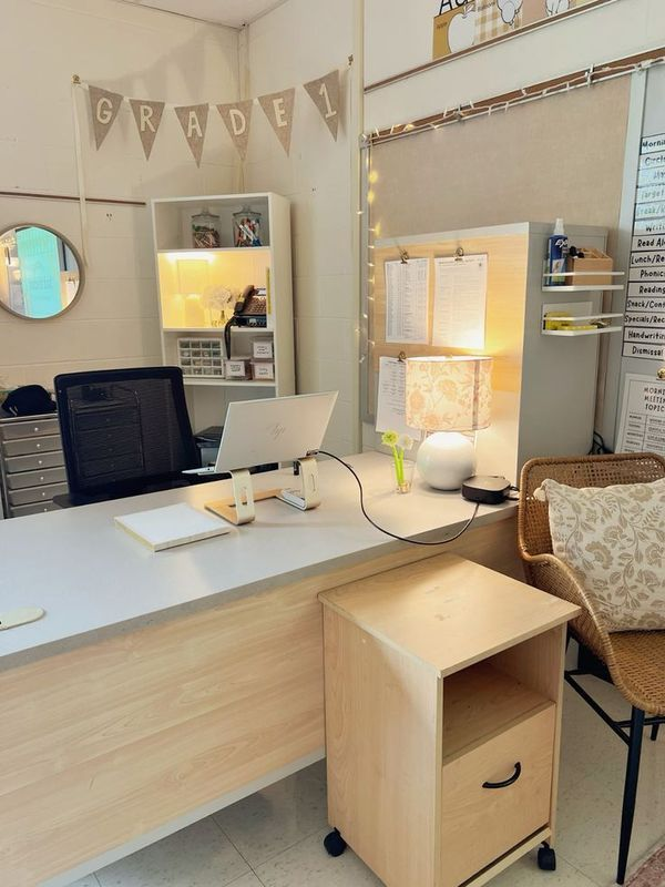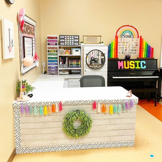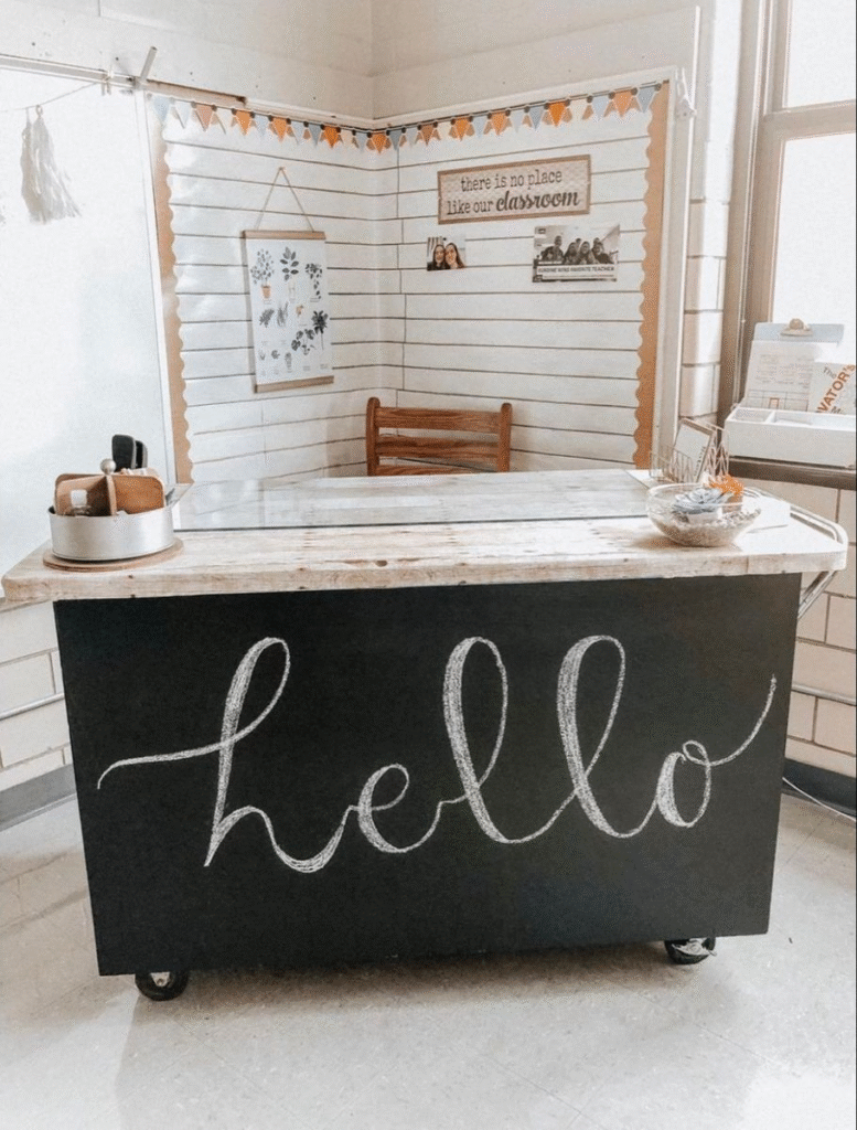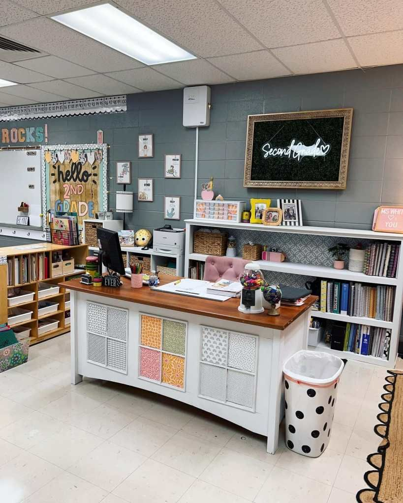 This wreath-themed teacher desk exudes charm and elegance. Its design adds a welcoming touch, and the decorative wreath instantly elevates the aesthetic of the classroom.