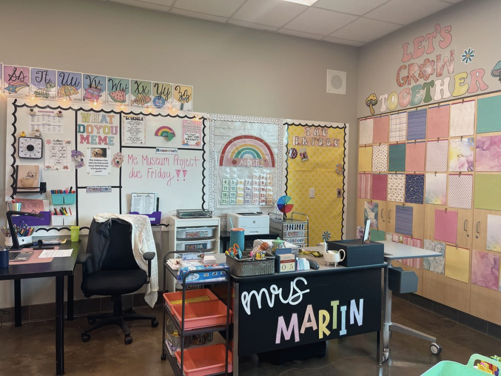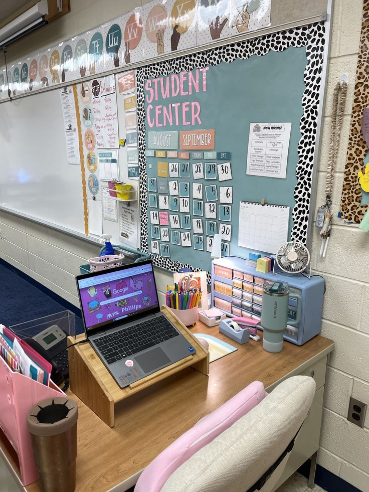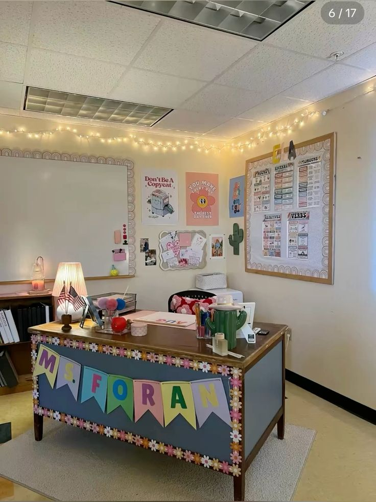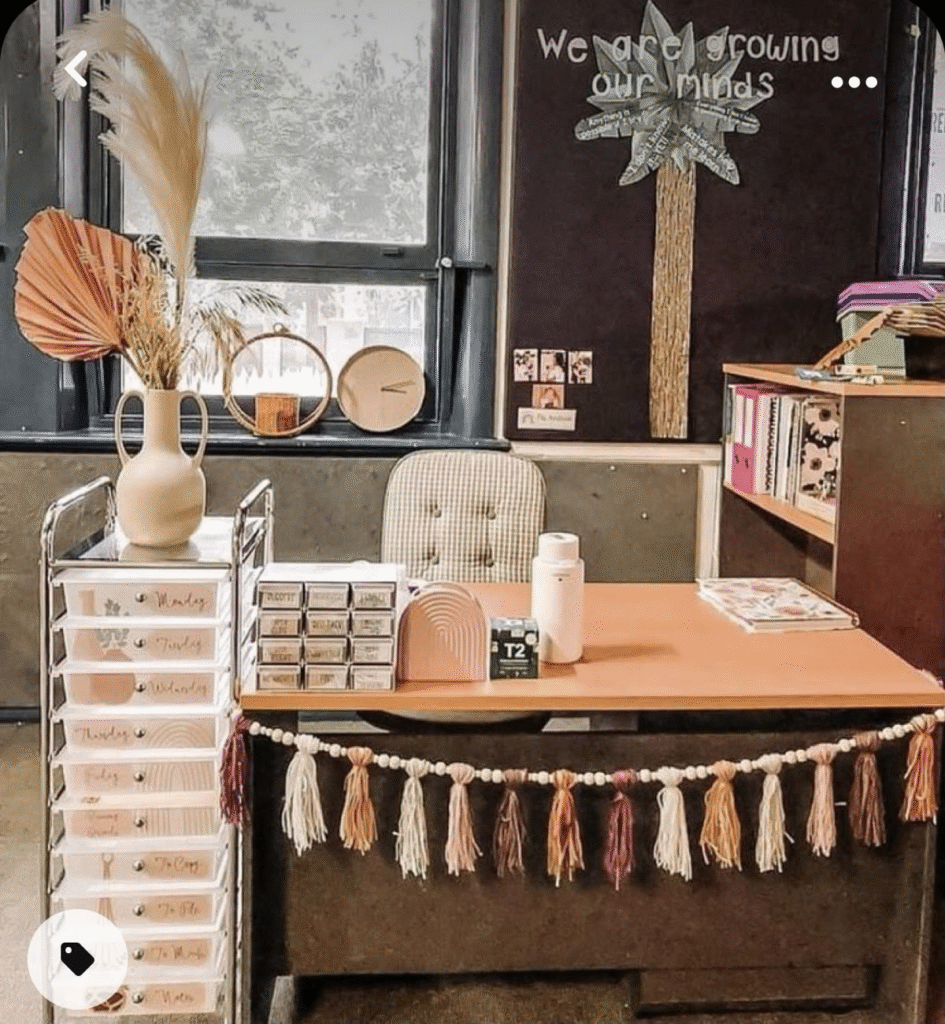 This wreath-themed teacher desk exudes charm and elegance. Its design adds a welcoming touch, and the decorative wreath instantly elevates the aesthetic of the classroom.