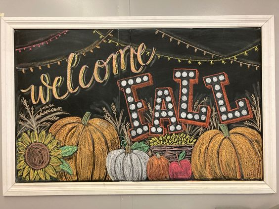 A “Welcome Fall” chalkboard embraces the transition into the cooler months and sets the tone for Thanksgiving. This design works well throughout the autumn season, making it versatile and useful beyond the holiday. Incorporating leaves, pumpkins, or cozy phrases adds to the charm. It’s an inviting way to celebrate both the arrival of fall and the Thanksgiving spirit.