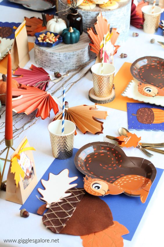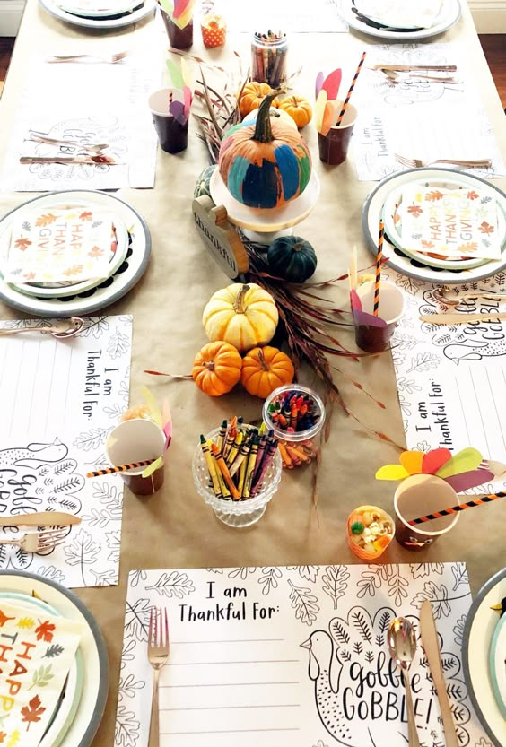 A colorful table setup adds energy and excitement to the celebration. Mix and match vibrant plates, cups, and napkins in seasonal colors like orange, red, and yellow. Incorporate cheerful elements like rainbow-colored garlands or playful name tags to keep things bright and lively. This design encourages kids to immerse themselves in the festive spirit, making the meal a joyful experience for everyone.