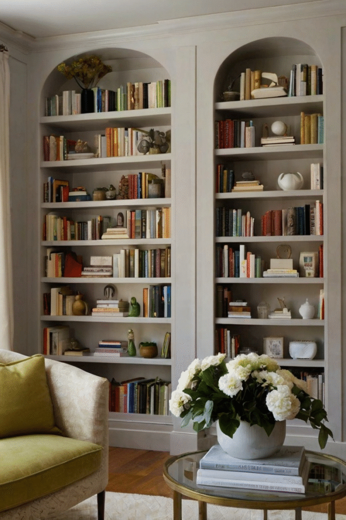 Built-ins add architectural interest while providing a beautiful display area for books and decorative pieces. Painting them white or blending them with the wall color creates a cohesive look. Arrange items thoughtfully—mixing books with framed photos, plants, and small sculptures prevents shelves from feeling cluttered. The result is a purposeful, polished display.