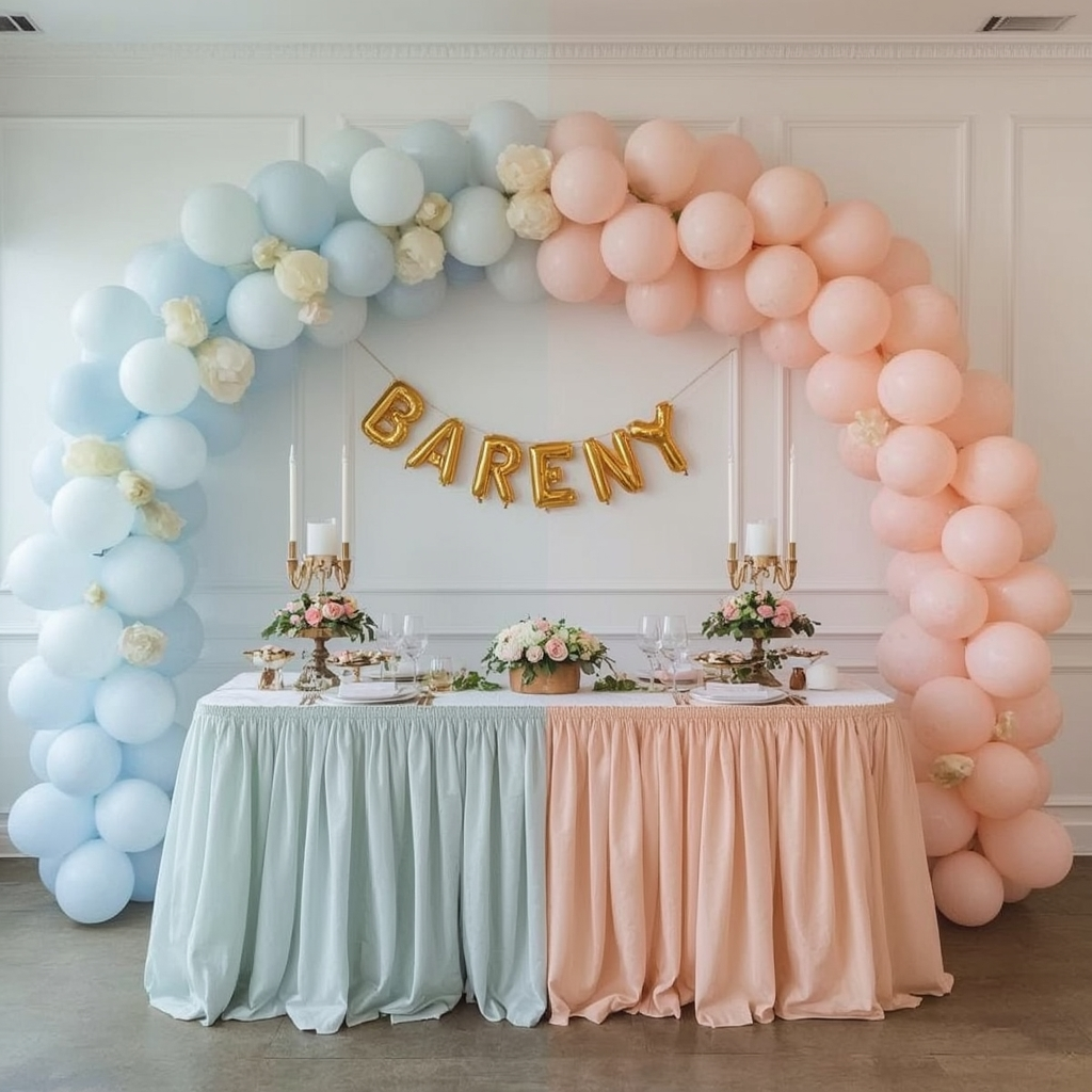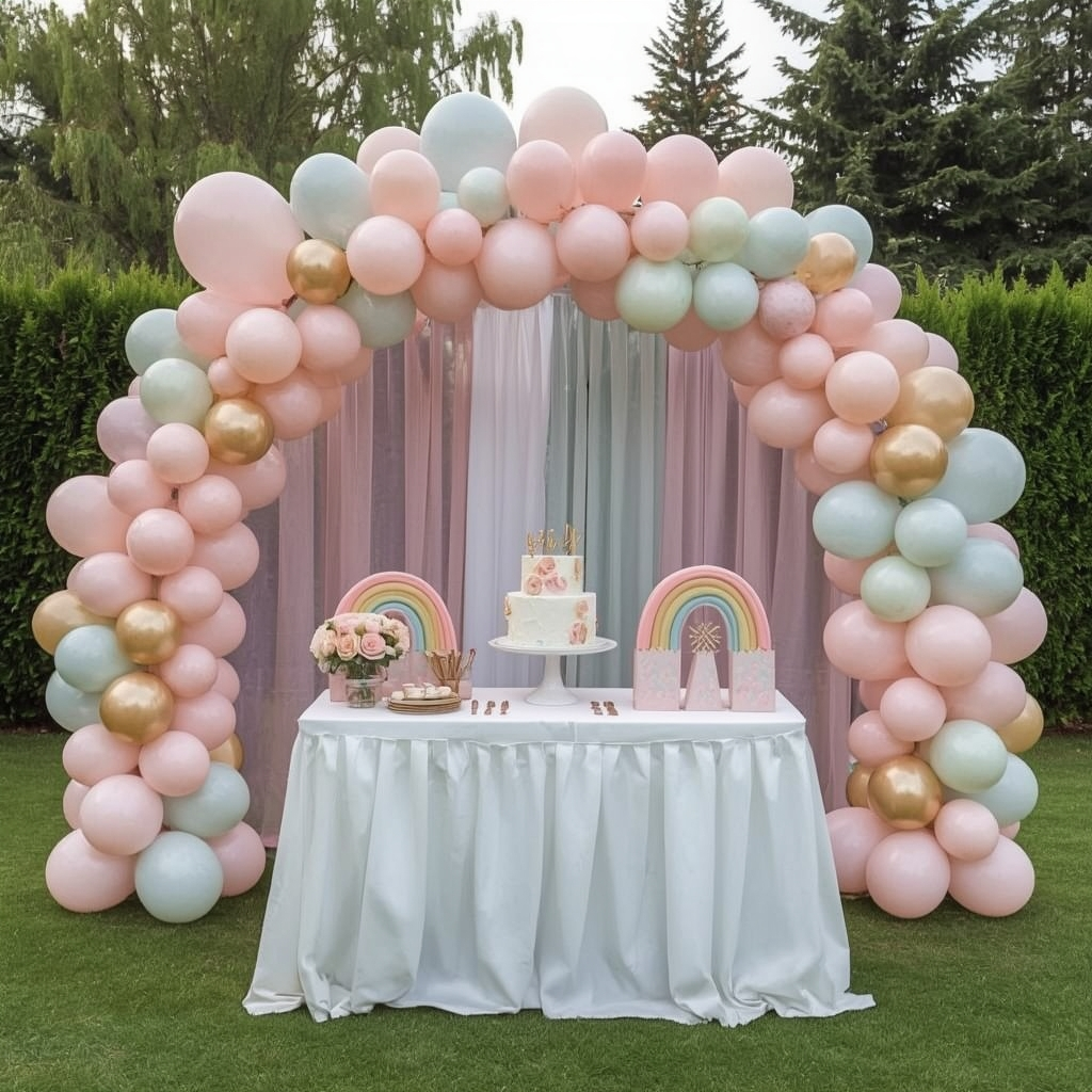 Honor the joy of welcoming twins with a cheerful double rainbow theme. Incorporate paired rainbow arches at the entrance or behind the dessert table to immediately highlight the “two blessings” concept. Choose soft pastel tones—such as blush, lavender, mint, and baby blue—to keep the design light and harmonious rather than overwhelming.