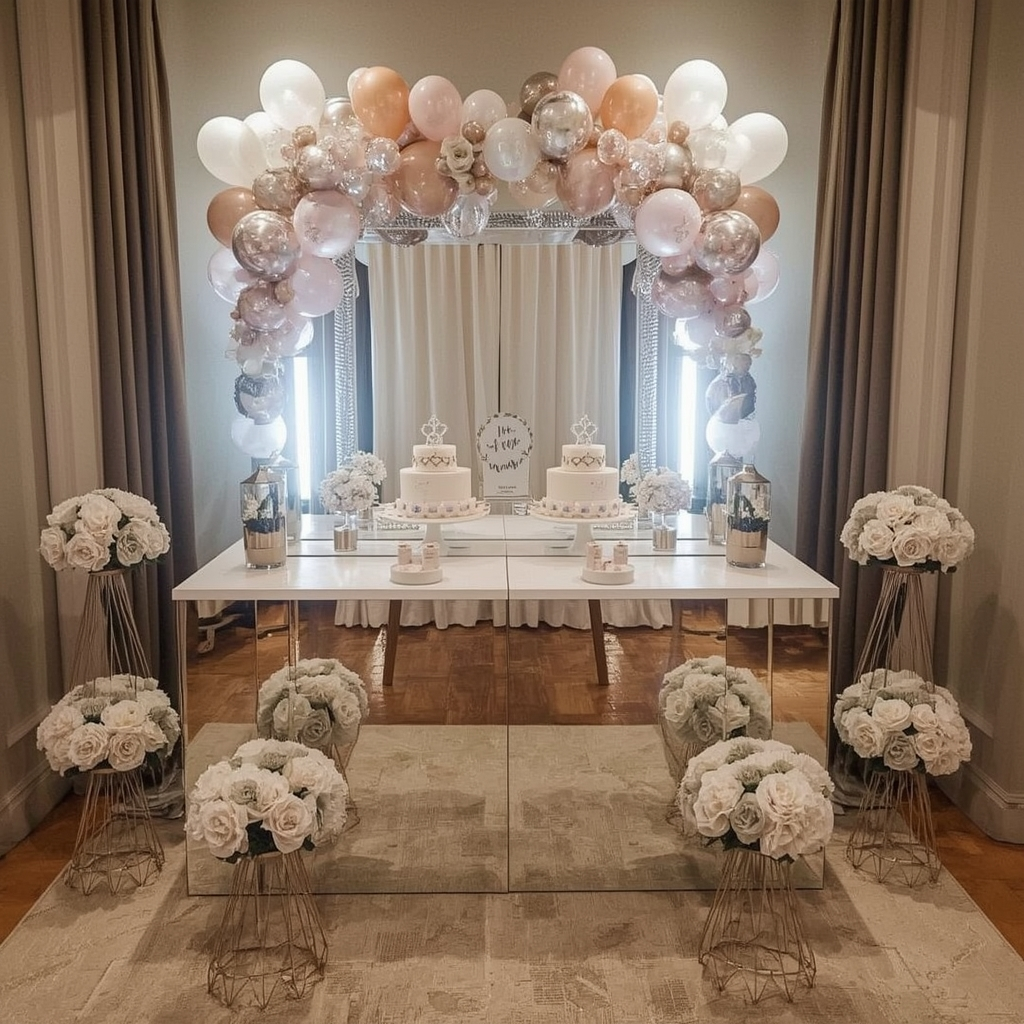 A reflective welcome sign or mirrored frames can enhance the modern feel of the event. Even the dessert table can be split evenly, with matching arrangements on both sides for a cohesive look.