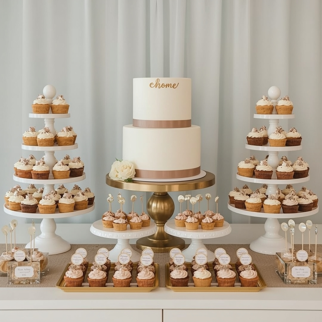 Keep the arrangement neat and intentional. Use matching cake stands and coordinated linens to maintain visual balance. Clear labeling helps guests identify options easily.