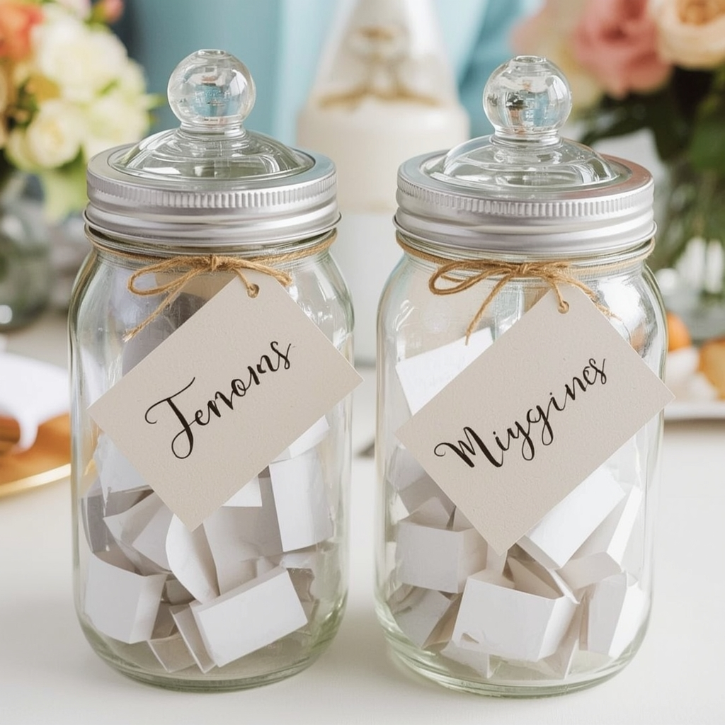Prepare two matching memory jars labeled individually for each twin. Guests can write advice, future predictions, or encouraging notes on small slips of paper and place them inside.