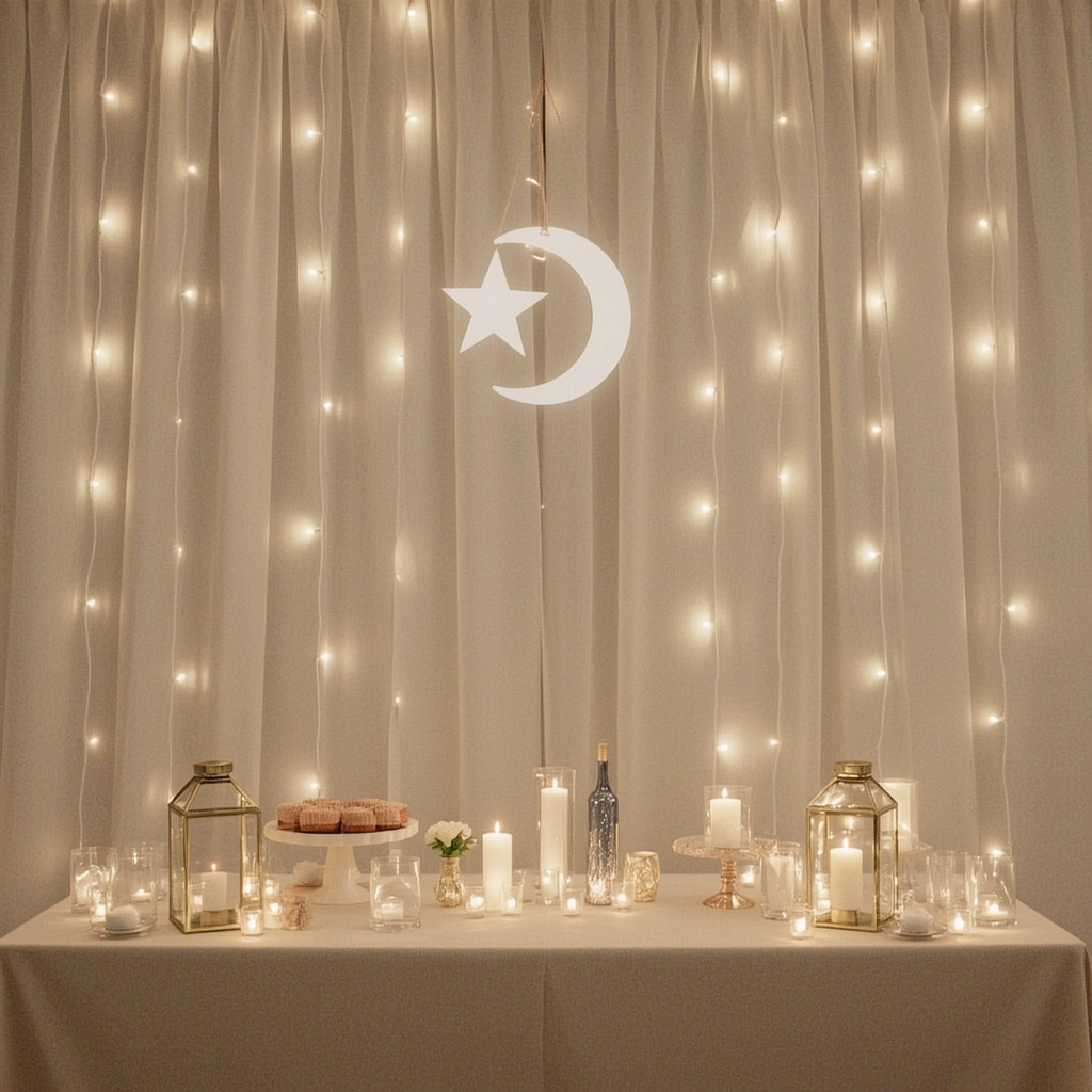 Create a dreamy atmosphere with a soft celestial theme featuring stars and subtle moon details. Use gentle lighting, such as warm string lights or lanterns, to enhance the magical feeling.