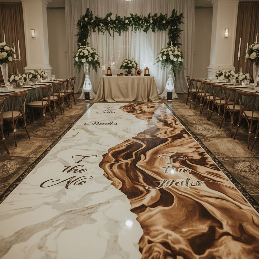 Design décor elements that visually represent two paths coming together. Use table runners, floor decals, or directional signs that merge into a central focal point, symbolizing unity and individuality.