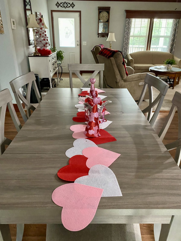 A message-based runner adds charm and meaning to the setup, making it ideal for modern spaces or casual Valentine’s dinners. It’s a simple addition that delivers visual impact while keeping the table functional and uncluttered.