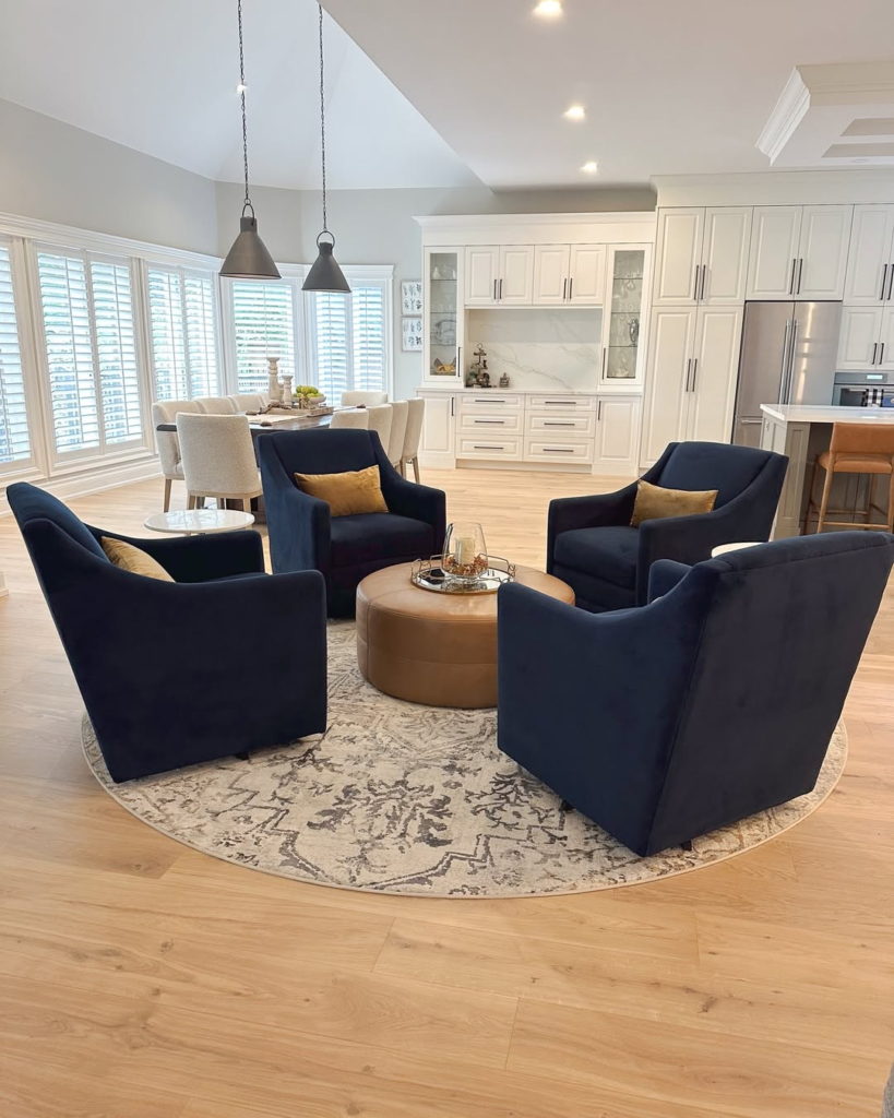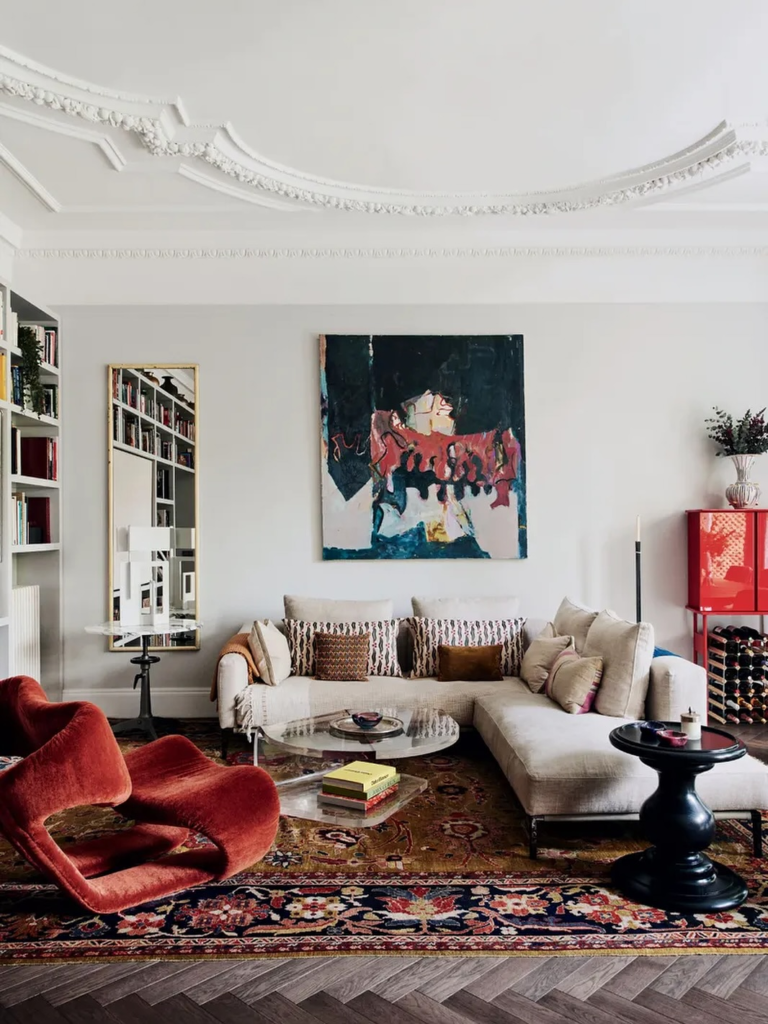 This living space feels thoughtfully collected, where every element has earned its place. Ornate ceiling details, textured rugs, and expressive artwork all come together, anchored by a plush velvet chair that grounds the room effortlessly. The upholstery introduces warmth and softness without competing with the architectural details, allowing the space to feel cohesive rather than crowded. The chair doesn’t rush the design—it settles in naturally, encouraging conversation and lingering moments. It’s a piece that adds intention to the room, making everything around it feel more deliberate and lived-in.