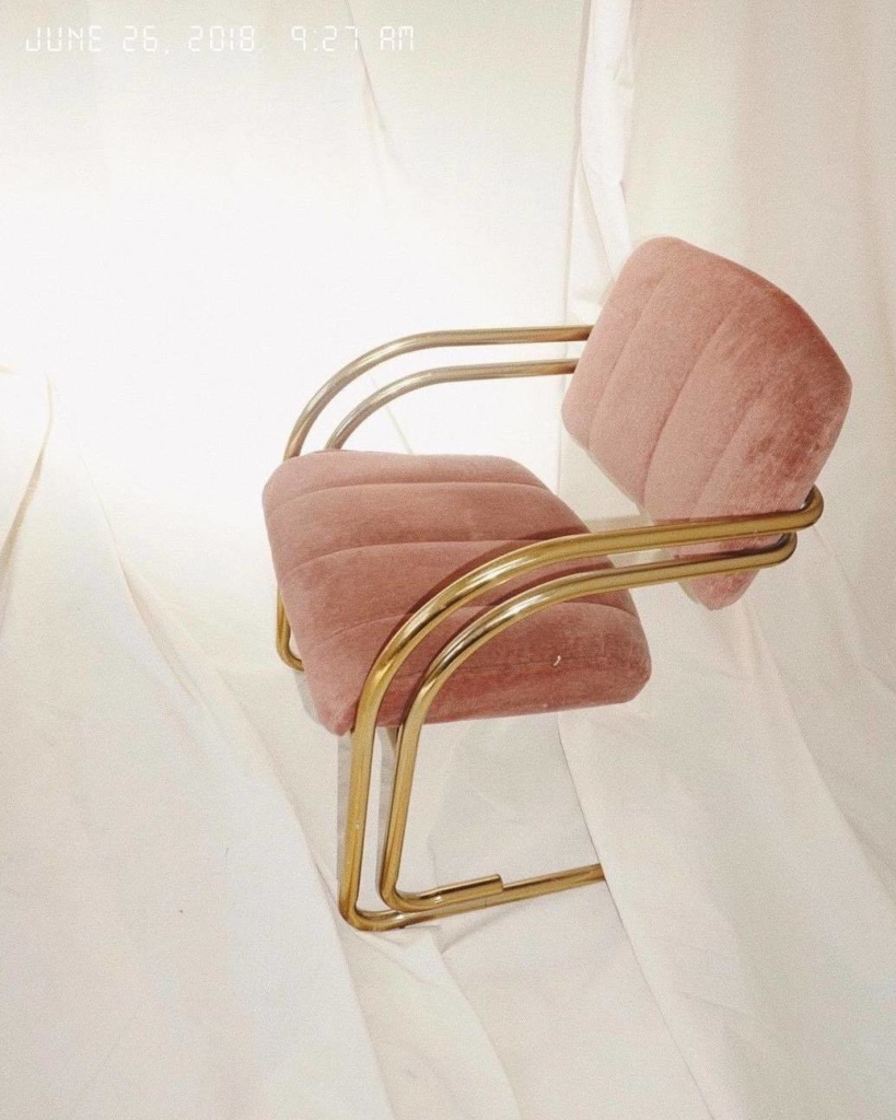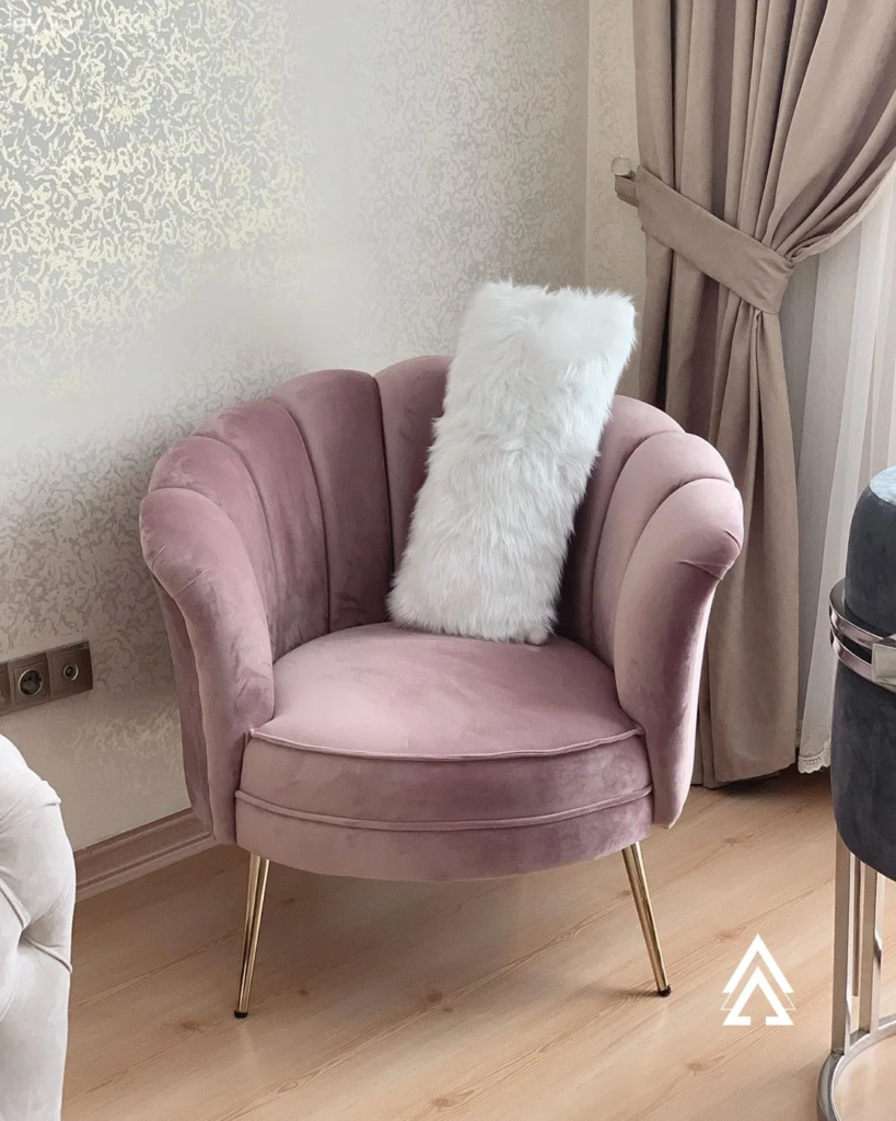 Blush velvet paired with metallic accents gives this chair a nostalgic charm that feels fresh rather than dated. There’s a cinematic quality to the design, as if it belongs in a classic film scene yet still fits seamlessly into modern interiors. The balance of softness and shine adds just enough drama to make the chair memorable without sacrificing comfort. It’s a statement piece that invites use, blending vintage influence with contemporary livability.