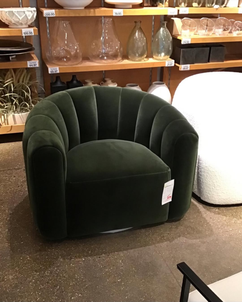 This deep green velvet chair commands attention through its color and sculptural form. The plush seat and shaped backrest create an inviting profile that draws you in immediately. Rather than overpowering the room, the bold hue adds depth and confidence, transforming the overall atmosphere. This chair has the ability to elevate a space instantly, adding a layer of drama that feels intentional and grounded rather than excessive.