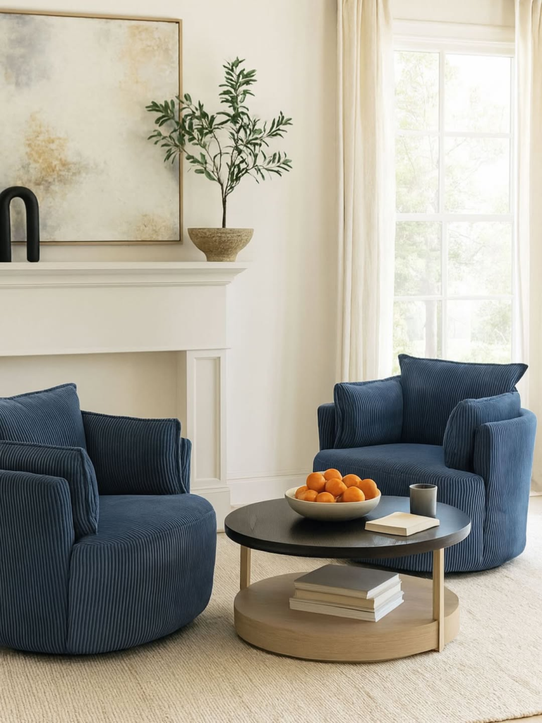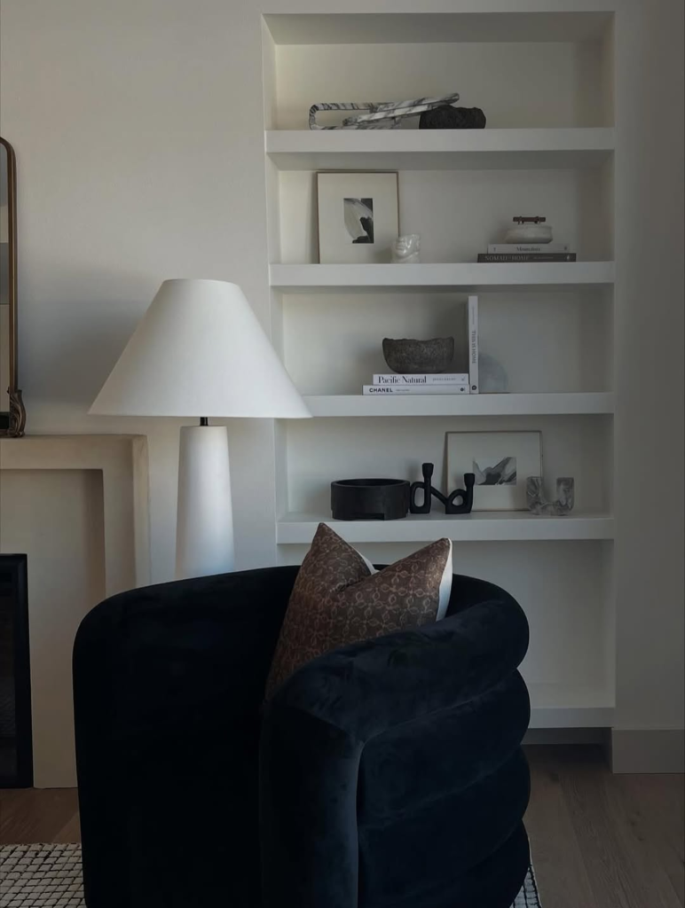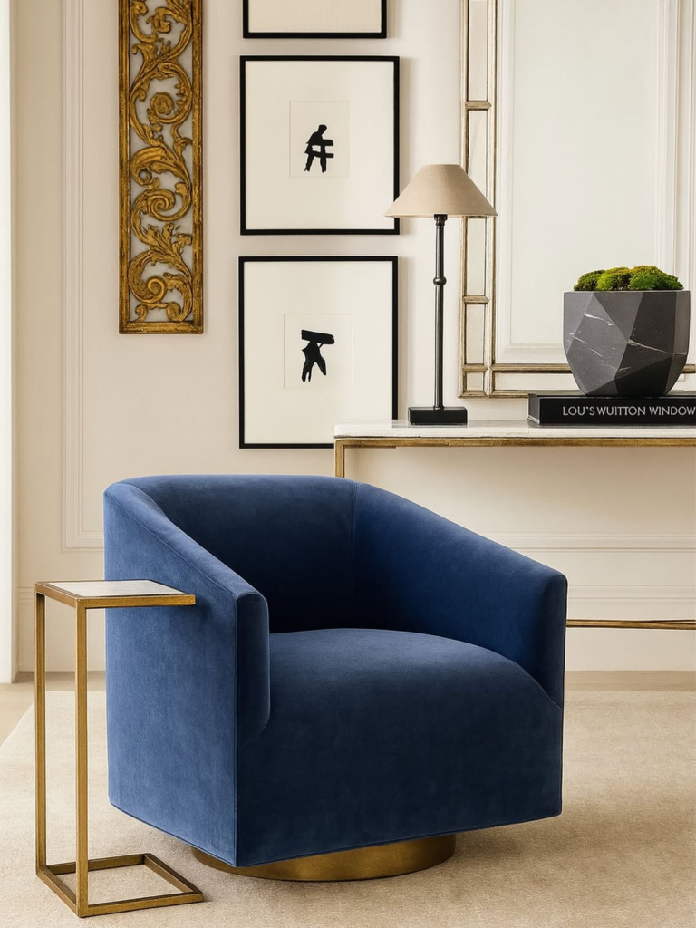A deep blue velvet chair brings a sense of refinement to the room, elevating the surrounding décor with ease. Paired with soft neutrals and tailored finishes, it feels timeless without leaning too traditional. The velvet adds richness while maintaining restraint, ensuring the chair enhances rather than overwhelms the space. It’s a piece that quietly improves everything around it, offering elegance through simplicity.