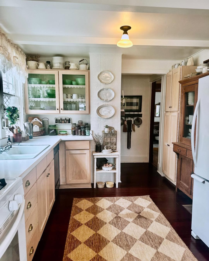 This kitchen exudes gentle vintage charm with every corner thoughtfully curated. Washed pine cabinetry, checkerboard jute rugs, and delicate café curtains create a homespun elegance reminiscent of a countryside cottage.