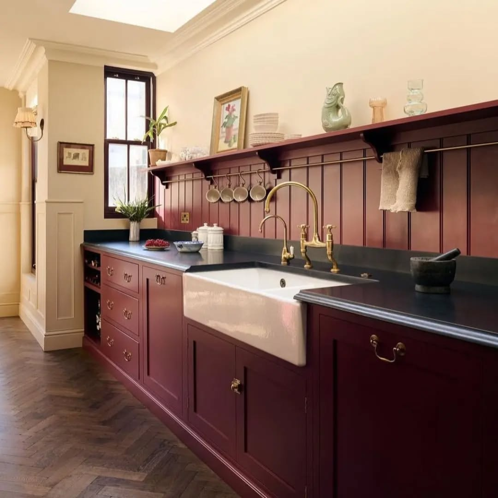 With deep claret cabinetry and an opulent farmhouse sink, this kitchen could easily belong in a London townhouse. Polished brass fixtures, dark countertops, and paneled walls create a bold yet sophisticated aesthetic.