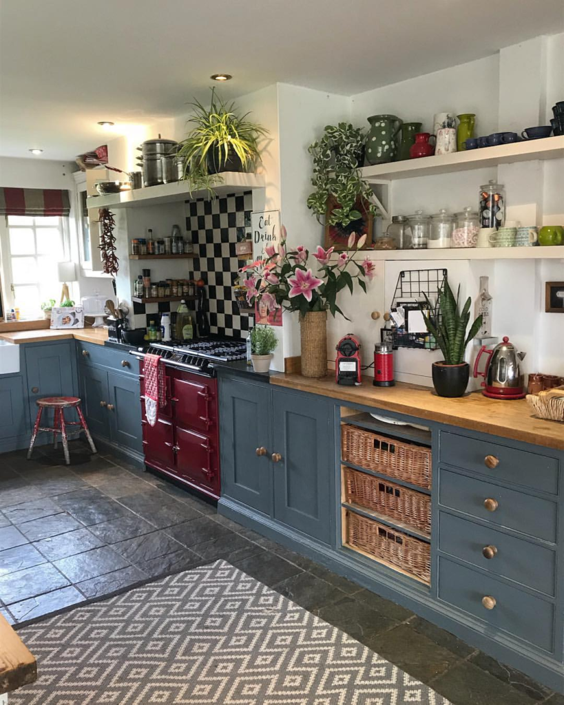 Baskets, open shelving, and a bold red range inject personality into this functional kitchen. The mix of leafy greens, vintage pottery, and checkerboard accents adds playful energy while honoring Victorian roots.
