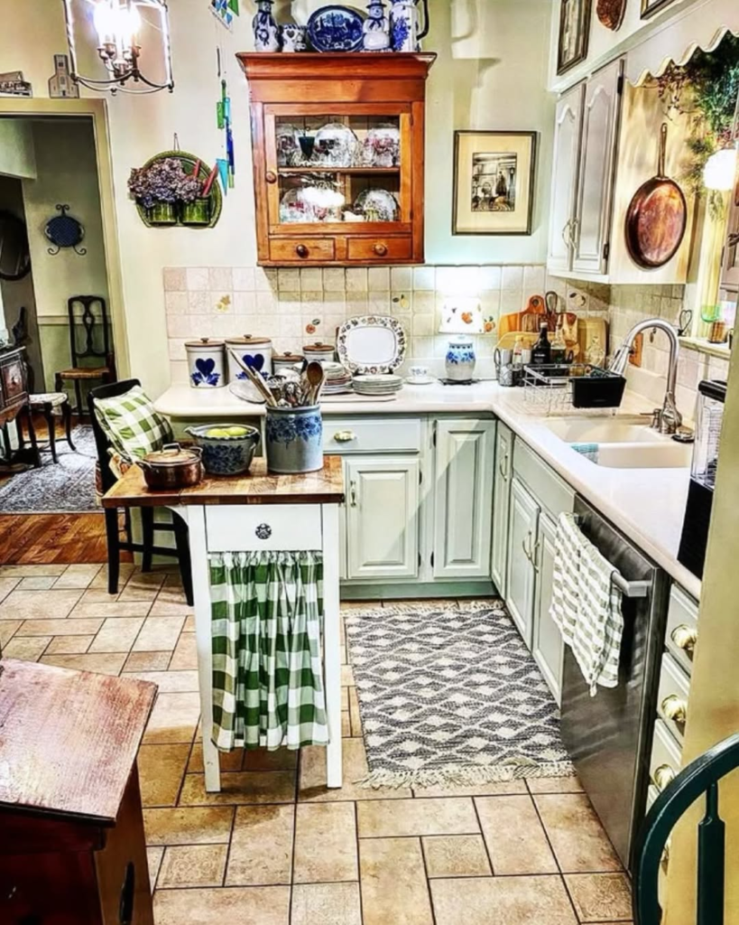 Cottagecore elements blend seamlessly with vintage finds, creating a kitchen that is as inviting as it is imaginative.