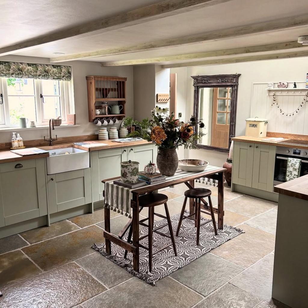 Pale sage cabinetry, soft stone floors, and a rustic bench table create a grounded, gentle palette. Vintage mirrors and wildflower arrangements enhance the lived-in feel.