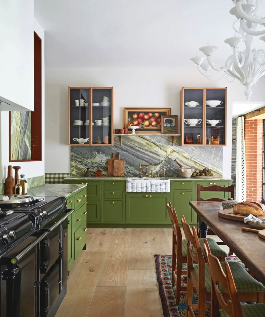 Bold green cabinetry and a striking stone backsplash make this kitchen feel playful yet luxurious. Gingham seating and antique wood chairs add layered character, while framed fruit still lifes nod to English tradition.