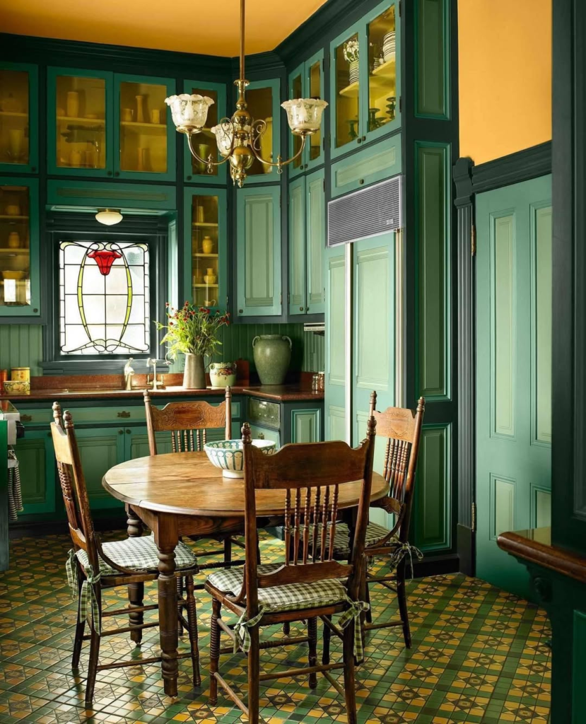 Chartreuse and emerald cabinetry, stained glass windows, and checkered floors make this kitchen bold and theatrical. Intricate moldings and classic furnishings keep the space grounded, balancing vibrant color with tradition.