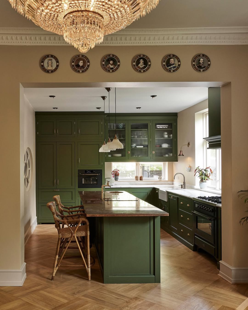 Symmetry and refinement define this Georgian-inspired kitchen. Deep olive cabinetry, porcelain chandeliers, and classic portraits evoke Jane Austen-era elegance.