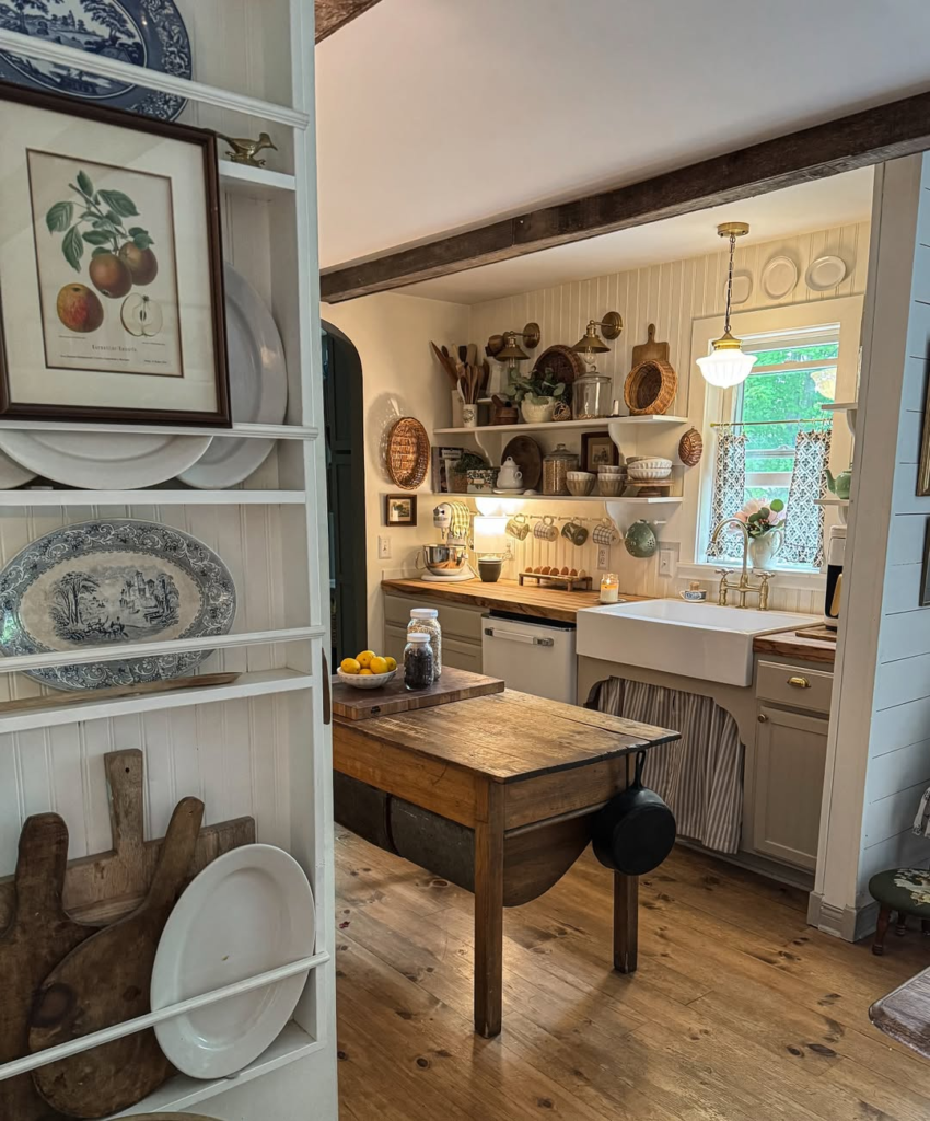 A central vintage worktable, open shelving brimming with pottery, and soft brass lighting create a kitchen full of comforting memories.