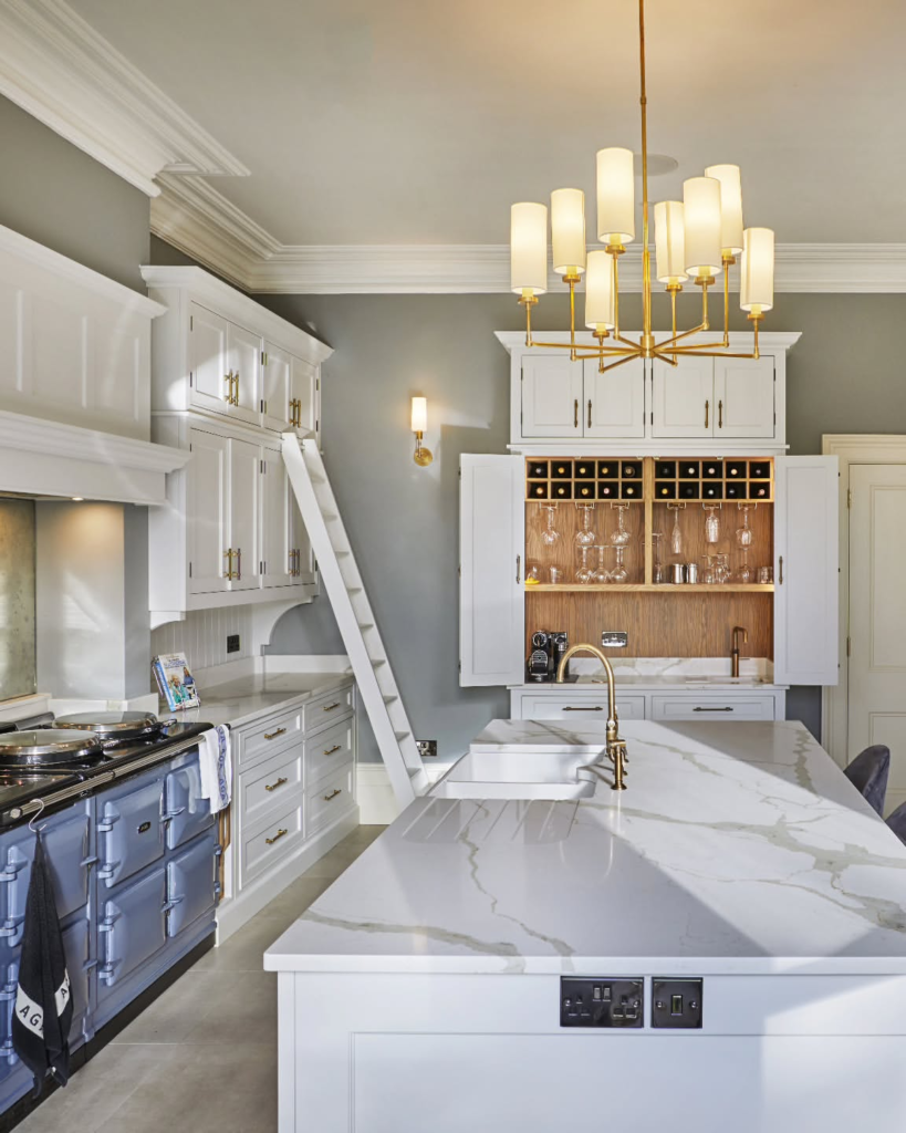 Marble countertops, pale cabinetry, and a library-style ladder create a kitchen of understated luxury. Soft gray walls allow vintage elements and elegant lighting to shine.