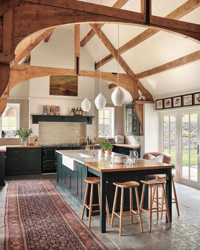 Exposed beams and arched ceilings give this kitchen the grandeur of an English hall. Deep forest green cabinetry is grounded by warm butcher block counters, with sunlight pouring in through French doors to soften the bold palette.