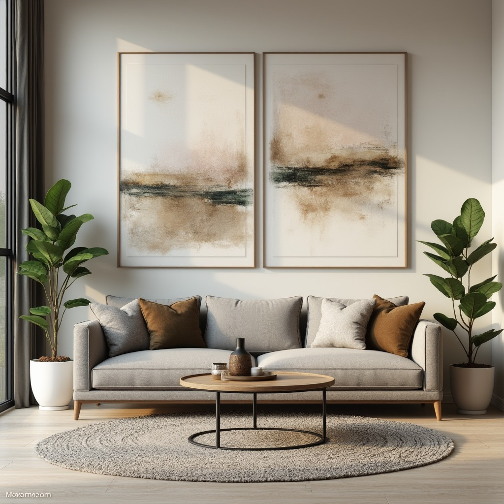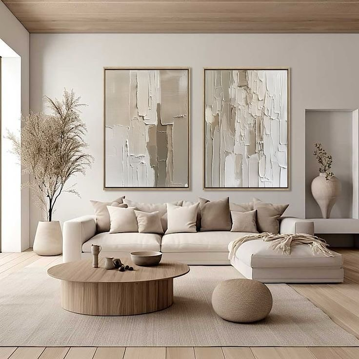 This variation on minimal style leans into softness and quiet contrast. The artwork blends seamlessly with the furniture, acting more as a supportive layer than a focal point. Gentle tones and understated compositions allow the room to breathe, making the entire living area feel more refined. By keeping the wall art subtle, the space gains an elevated feel—proof that less visual noise often results in a more luxurious overall impression.
